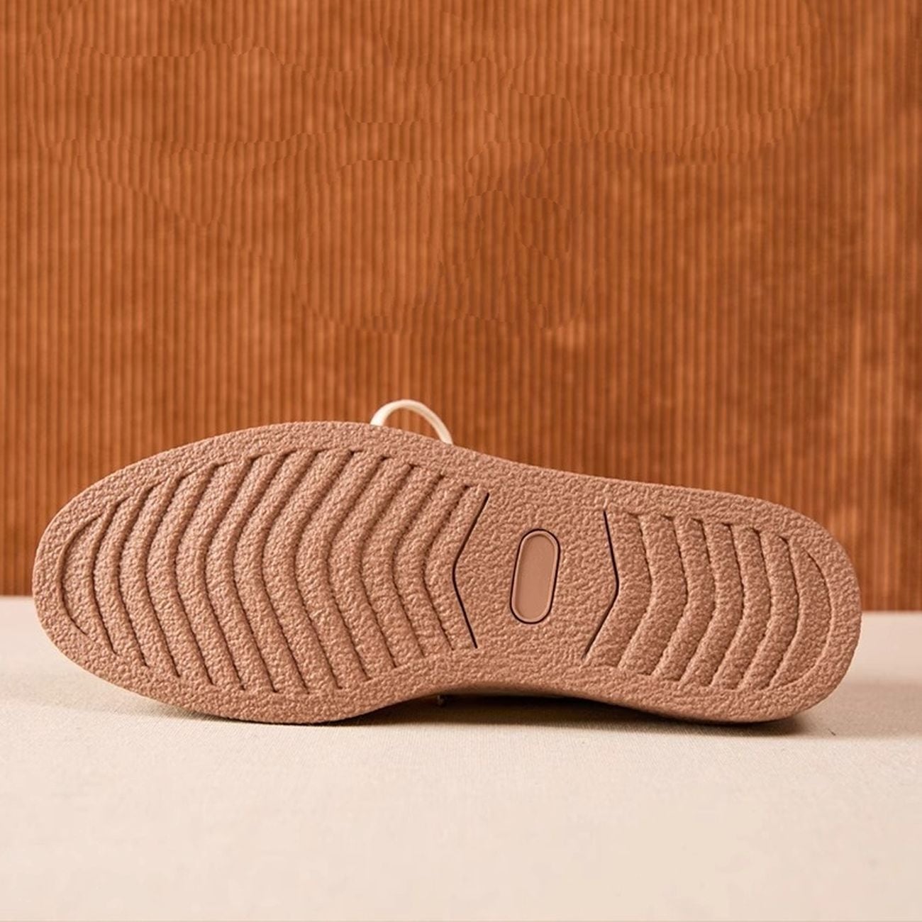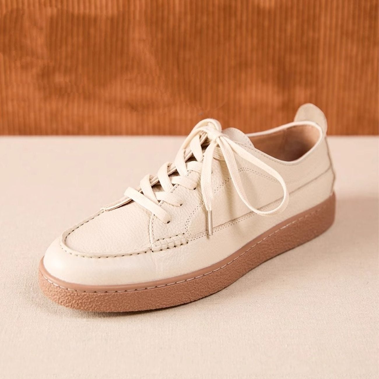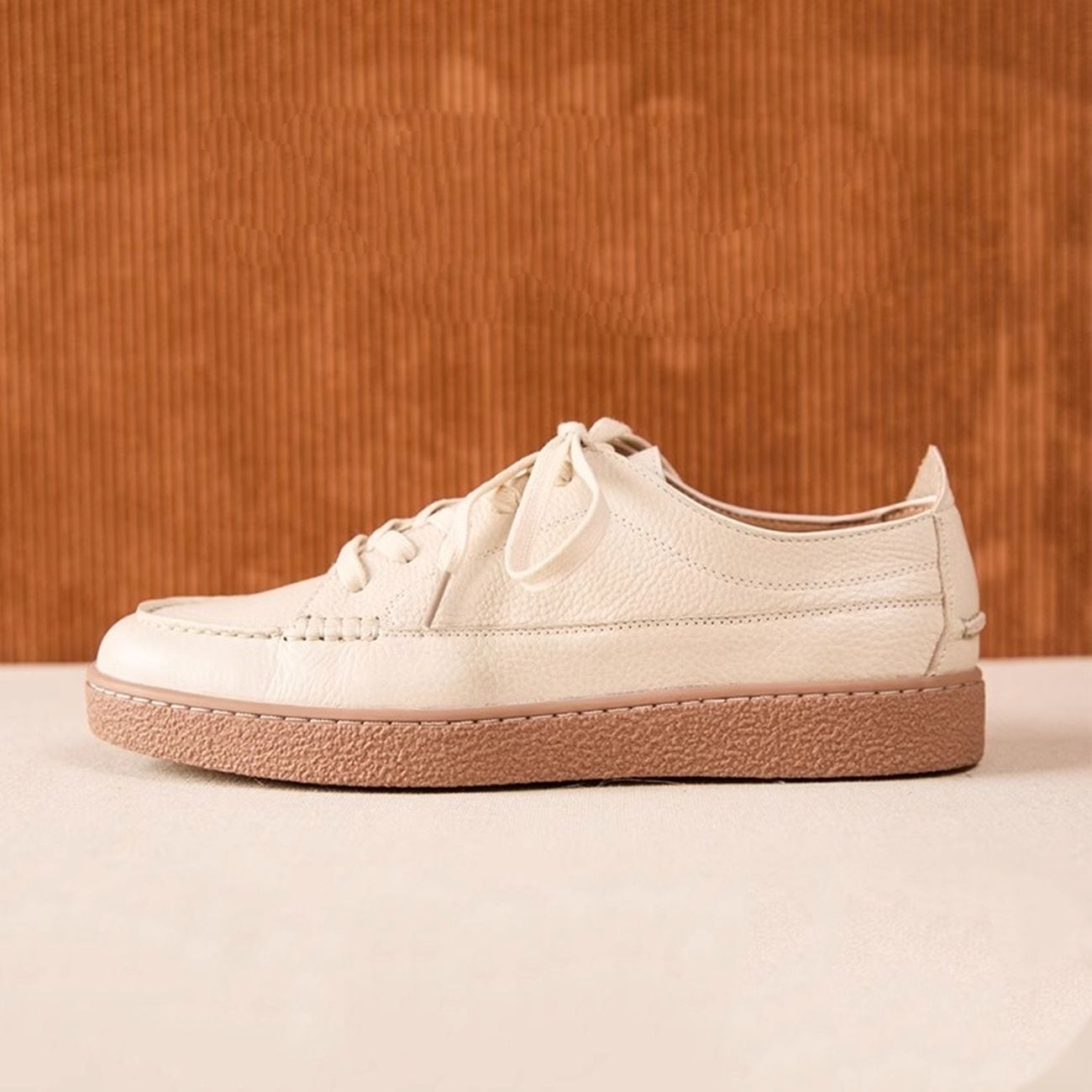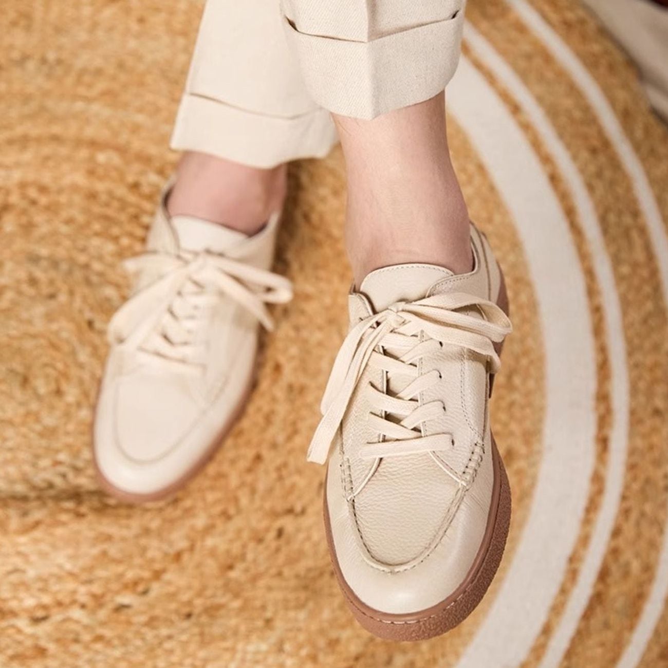 レザーを使用したシューズ。フラットソールで歩きやすく、デイリーコーデに自然と溶け込むデザインです。どんなスタイルにも合わせやすく、上品な印象を与えます。
