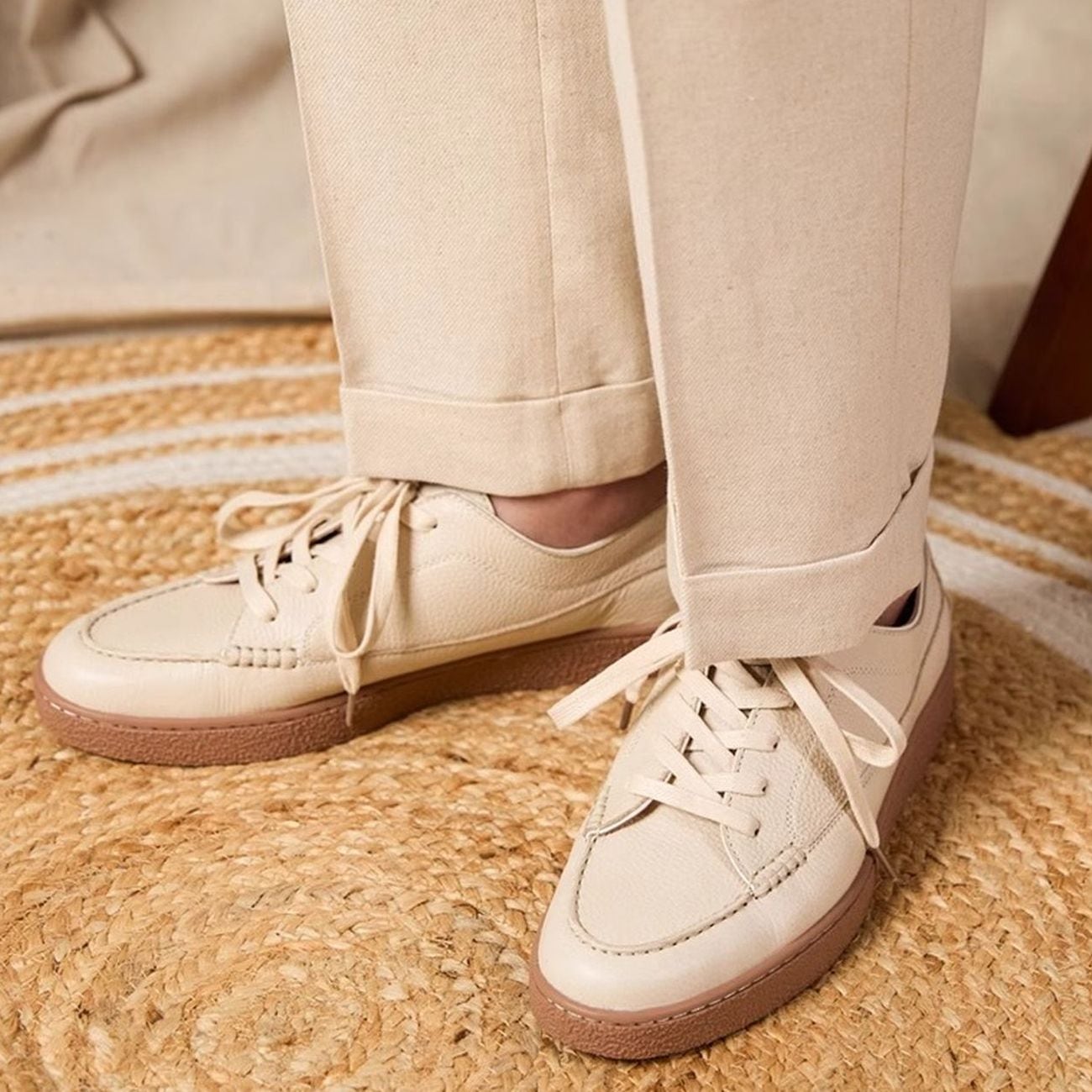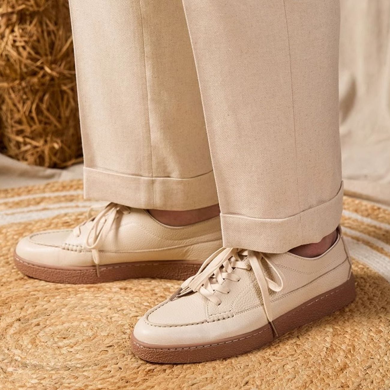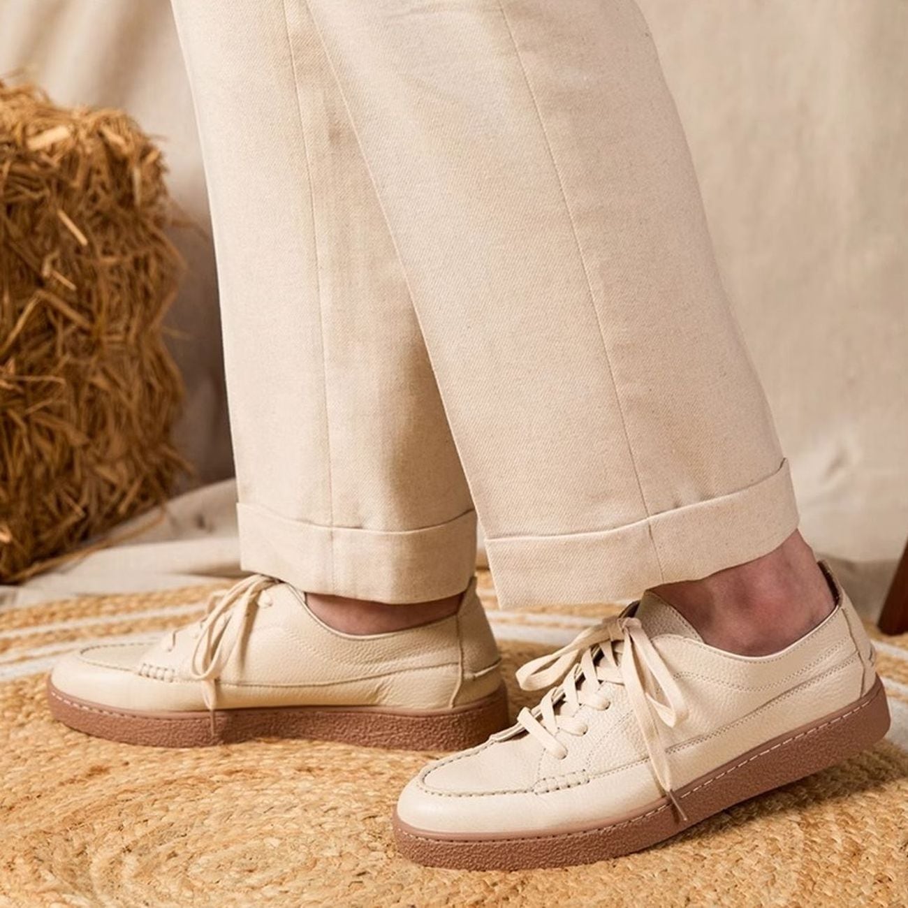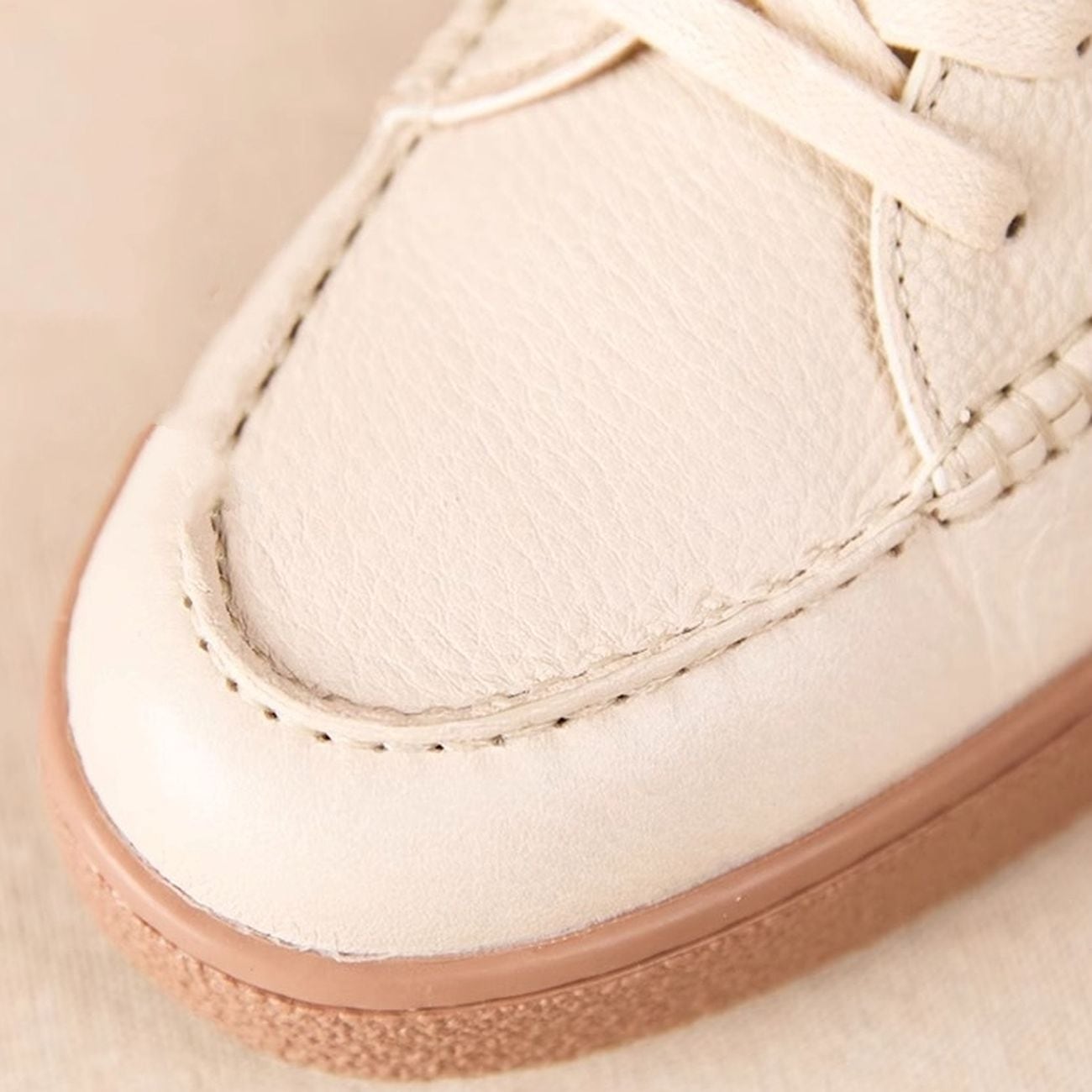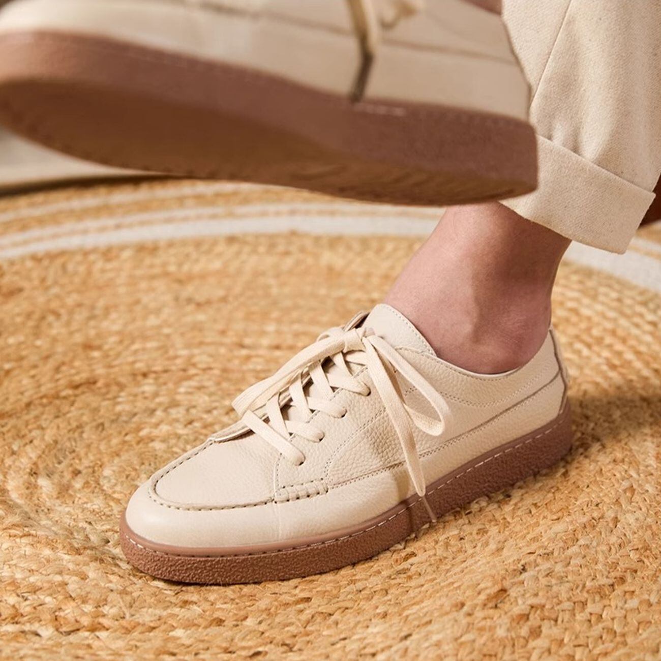 レザーを使用したシューズ。フラットソールで歩きやすく、デイリーコーデに自然と溶け込むデザインです。どんなスタイルにも合わせやすく、上品な印象を与えます。