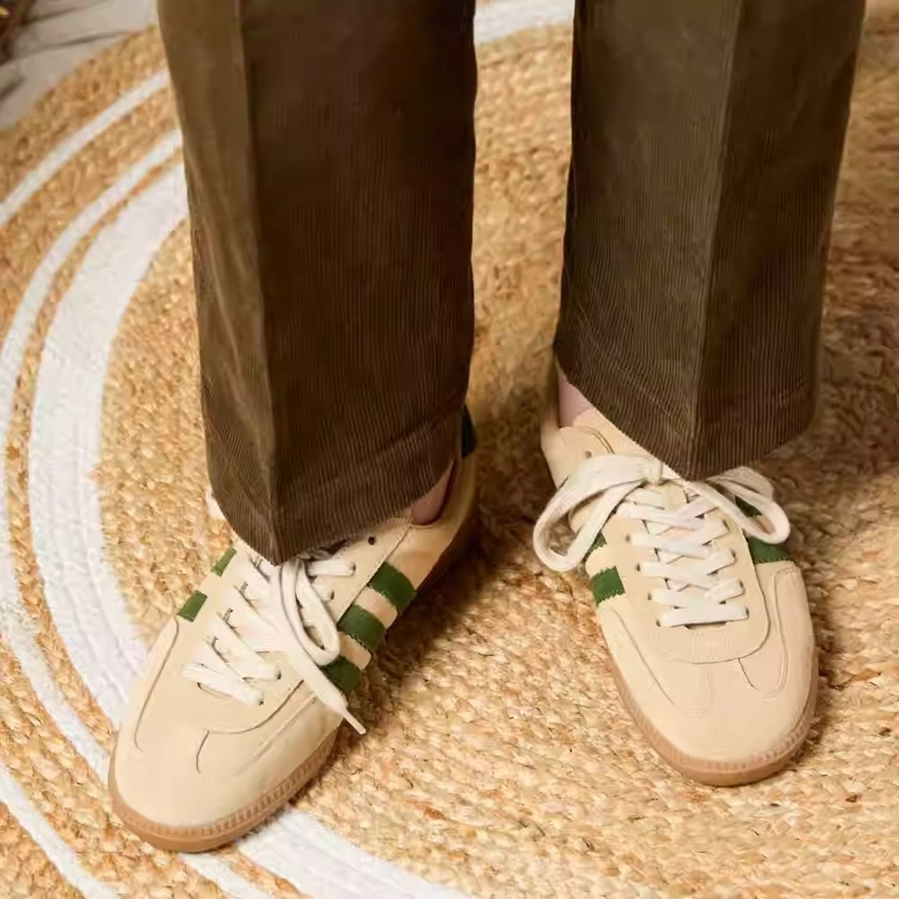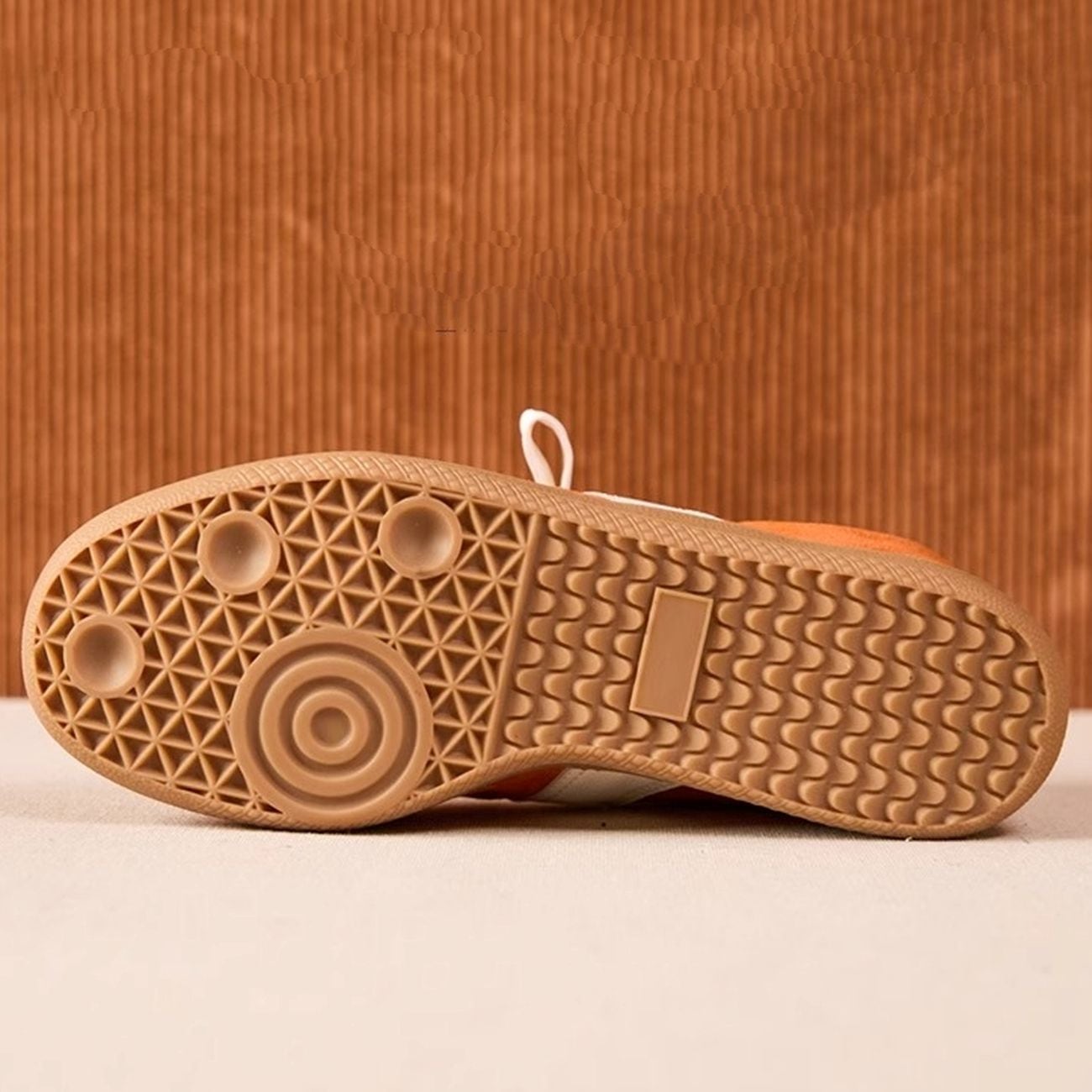 フラットソールが特徴のローカットシューズ。スエード素材の上品なオレンジカラーと、アクセントになったオフホワイトのラインが洗練された印象を与えます。デイリーユースはもちろん、カジュアルなシーンにも活躍する一足です。