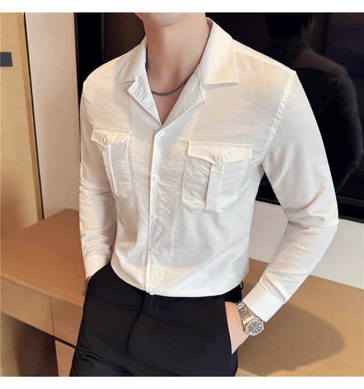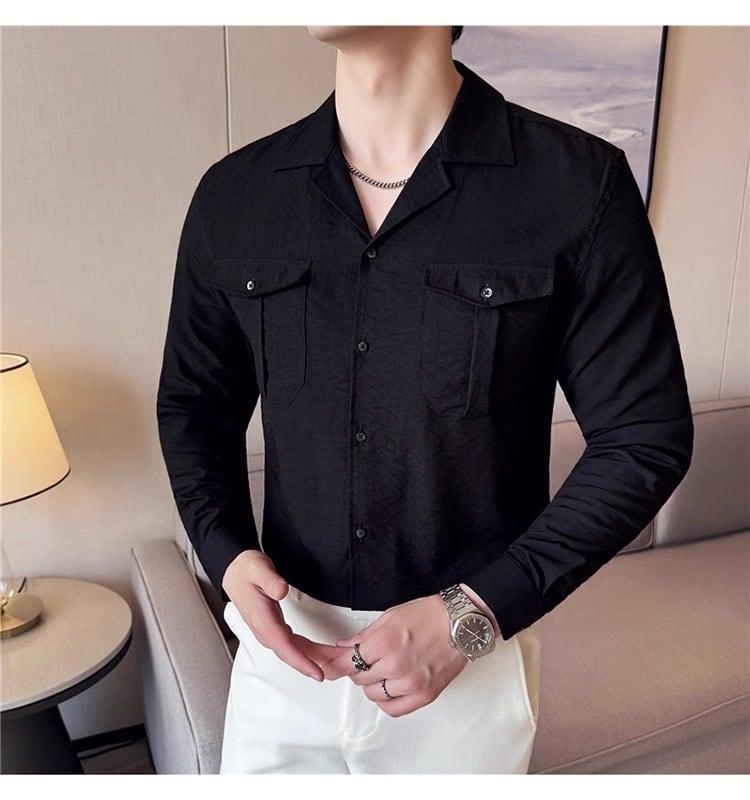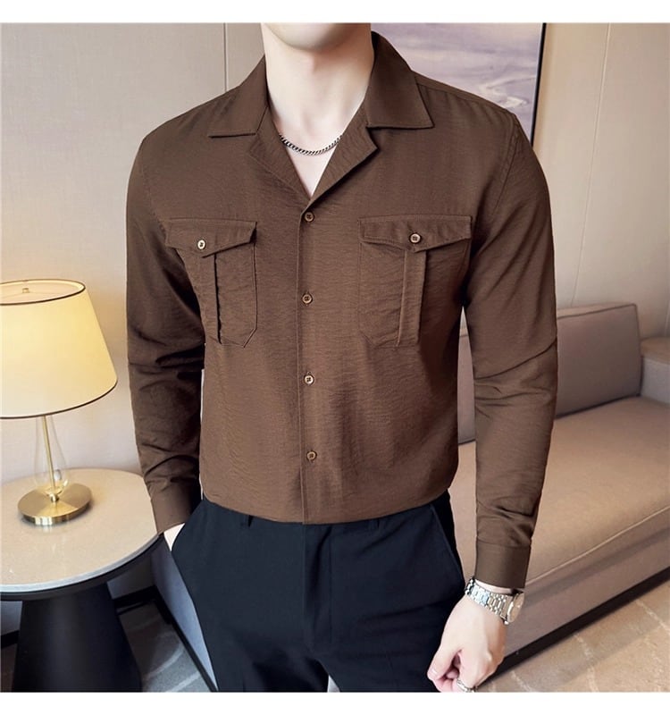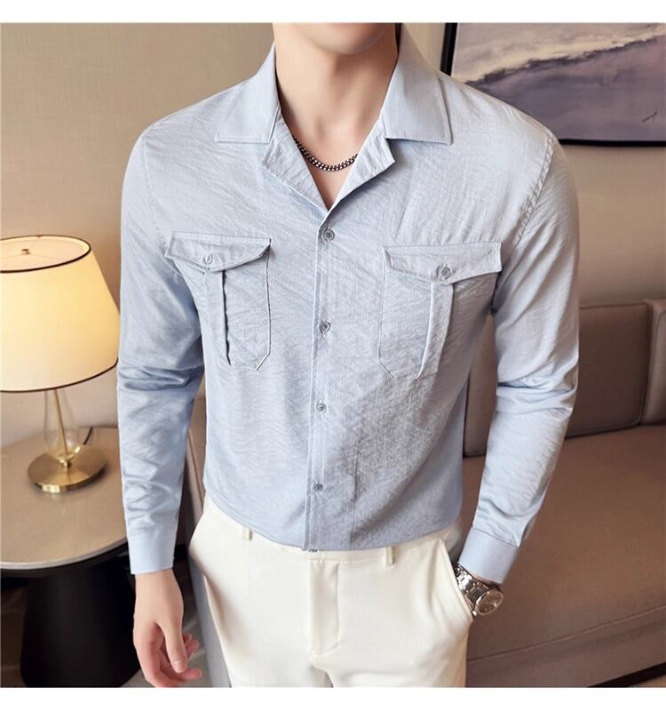 オープンカラー長袖シャツ パッチポケット付きボタンフロント 4color KA1266