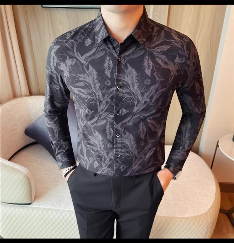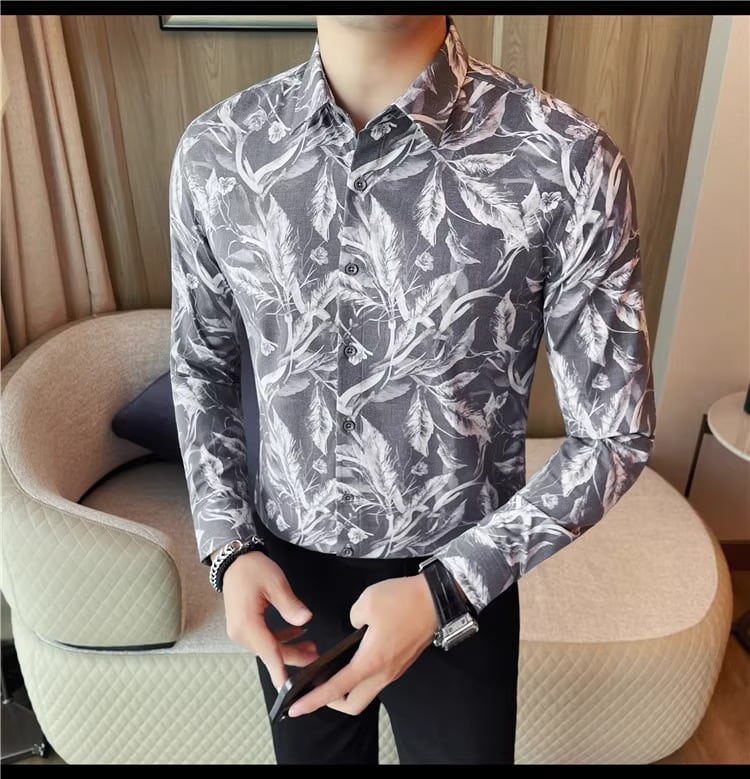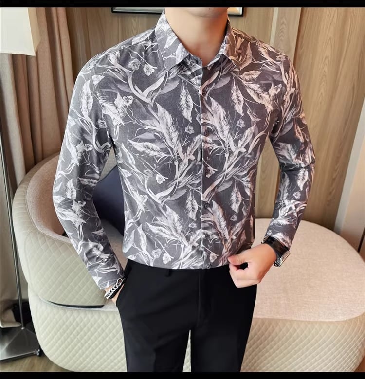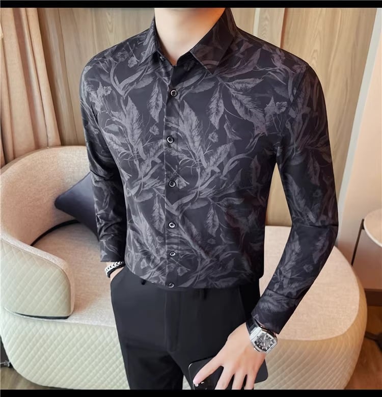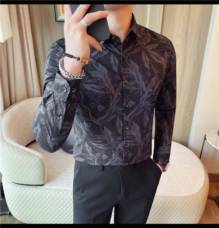 リーフ柄が印象的な長袖シャツ。ストレートシルエットで、様々なシーンで活躍します。落ち着いた色合いのリーフ柄は、ビジネスシーンにもカジュアルシーンにも自然と溶け込みます。デイリーユースに最適な一着です。