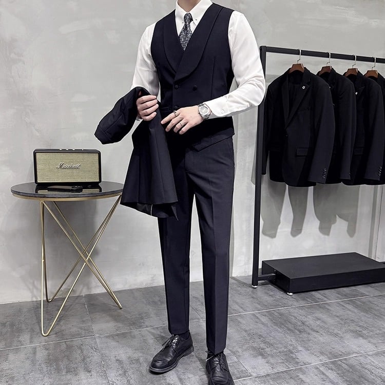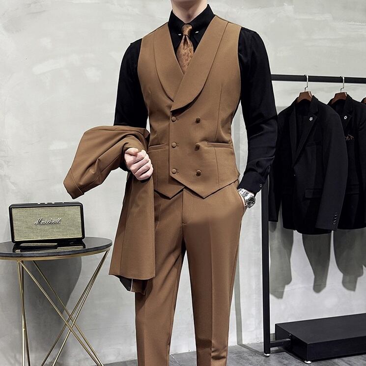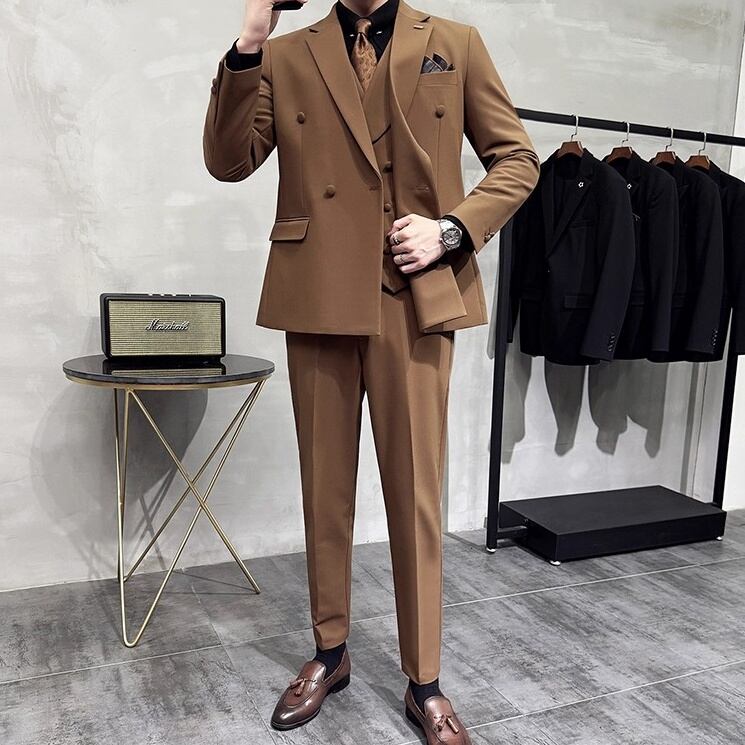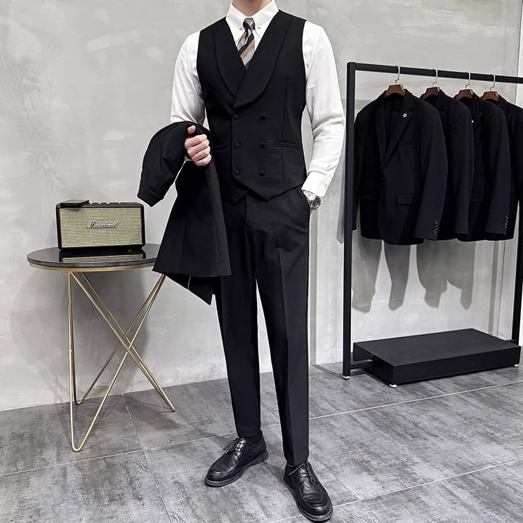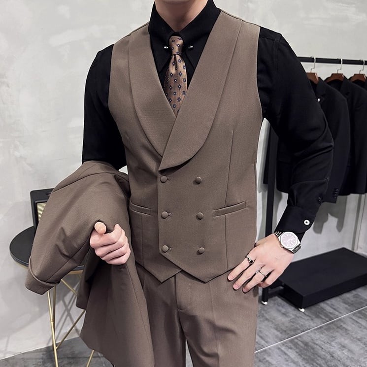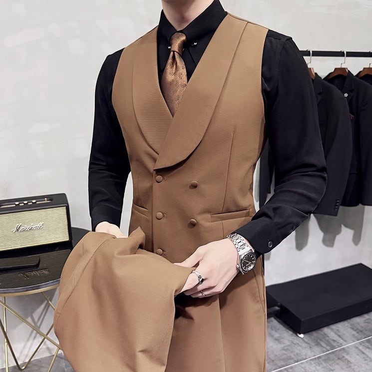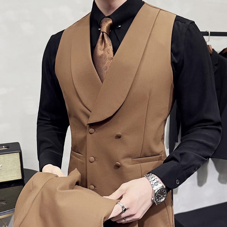 クラシックなダブルブレストベストが魅力のセットアップです。ベスト、パンツの2点セットで、フォーマルな場にもカジュアルな場面にも対応できる汎用性の高さが特徴です。洗練されたデザインは、着る人の品格を高め、ワンランク上のスタイルを演出します。