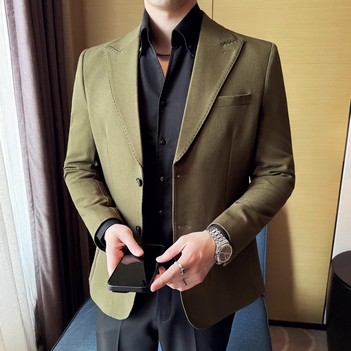 ビジネスシーンはもちろん、カジュアルな装いにもマッチします。
