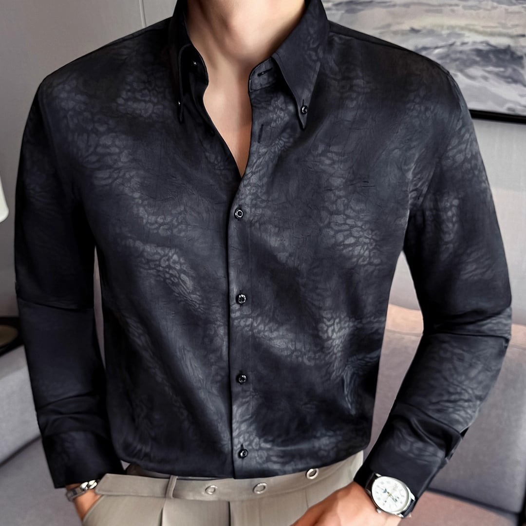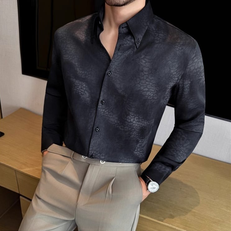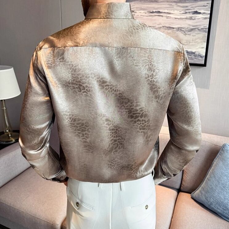 アニマルプリントが目を引く長袖シャツ。光沢のある生地感で、コーディネートに上品さをプラスします。パーティーシーンやナイトアウトなど、特別な日の装いに最適です。