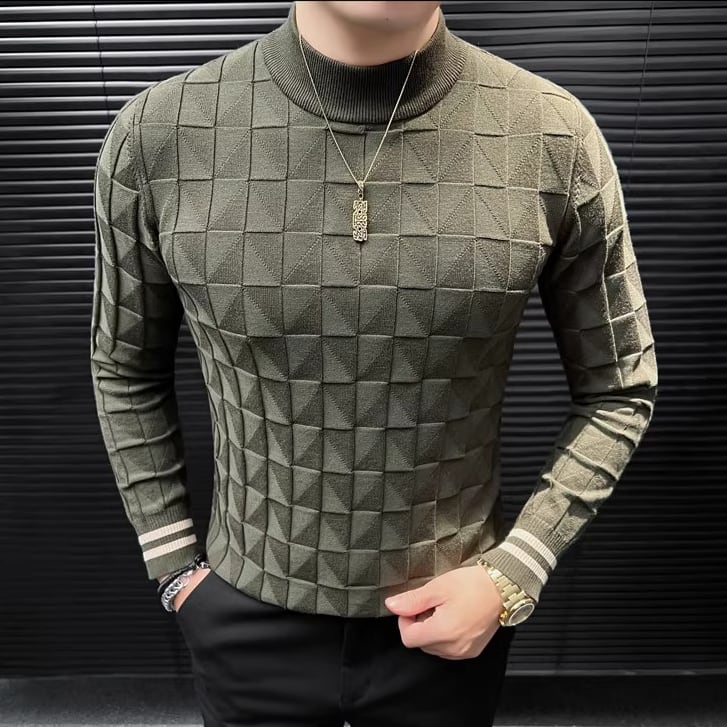 落ち着いた印象を与える、タイル柄のモックネックニット。
