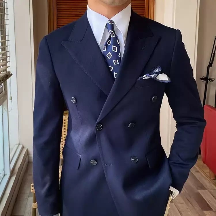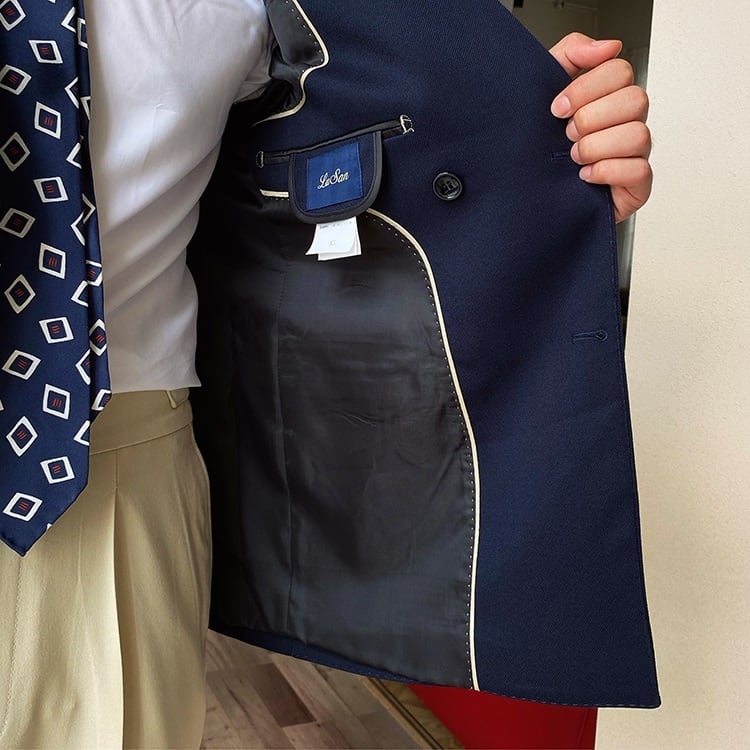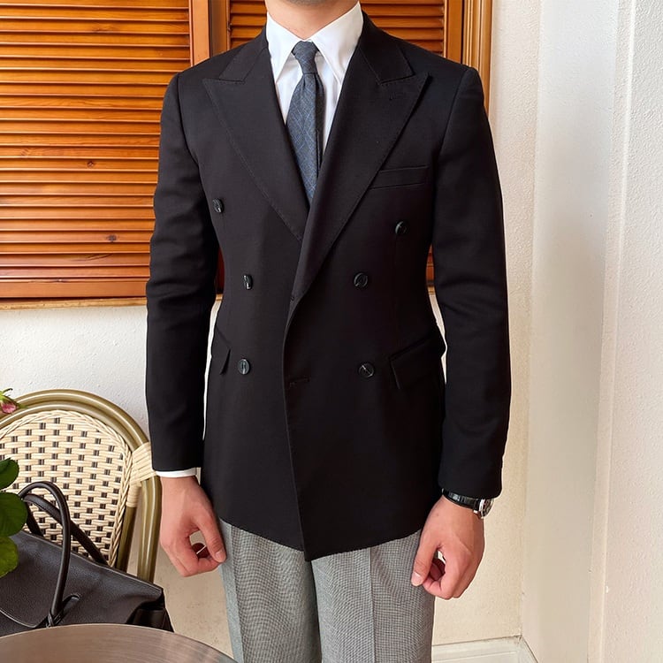 ダブルブレストのデザインが、普段のコーディネートを上品に引き締めます。