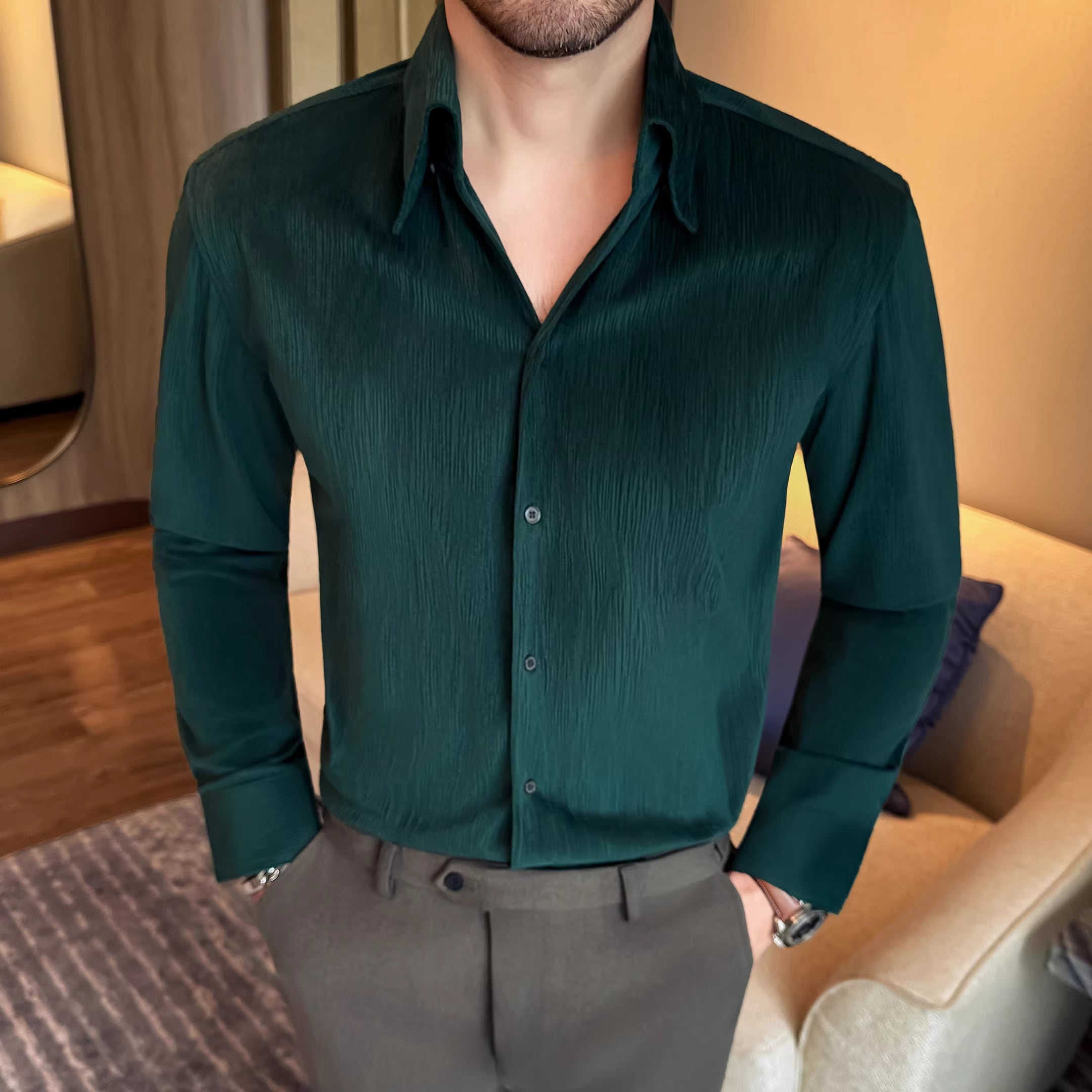 オープンカラーが首元をすっきりと見せ、上品さをプラスします。