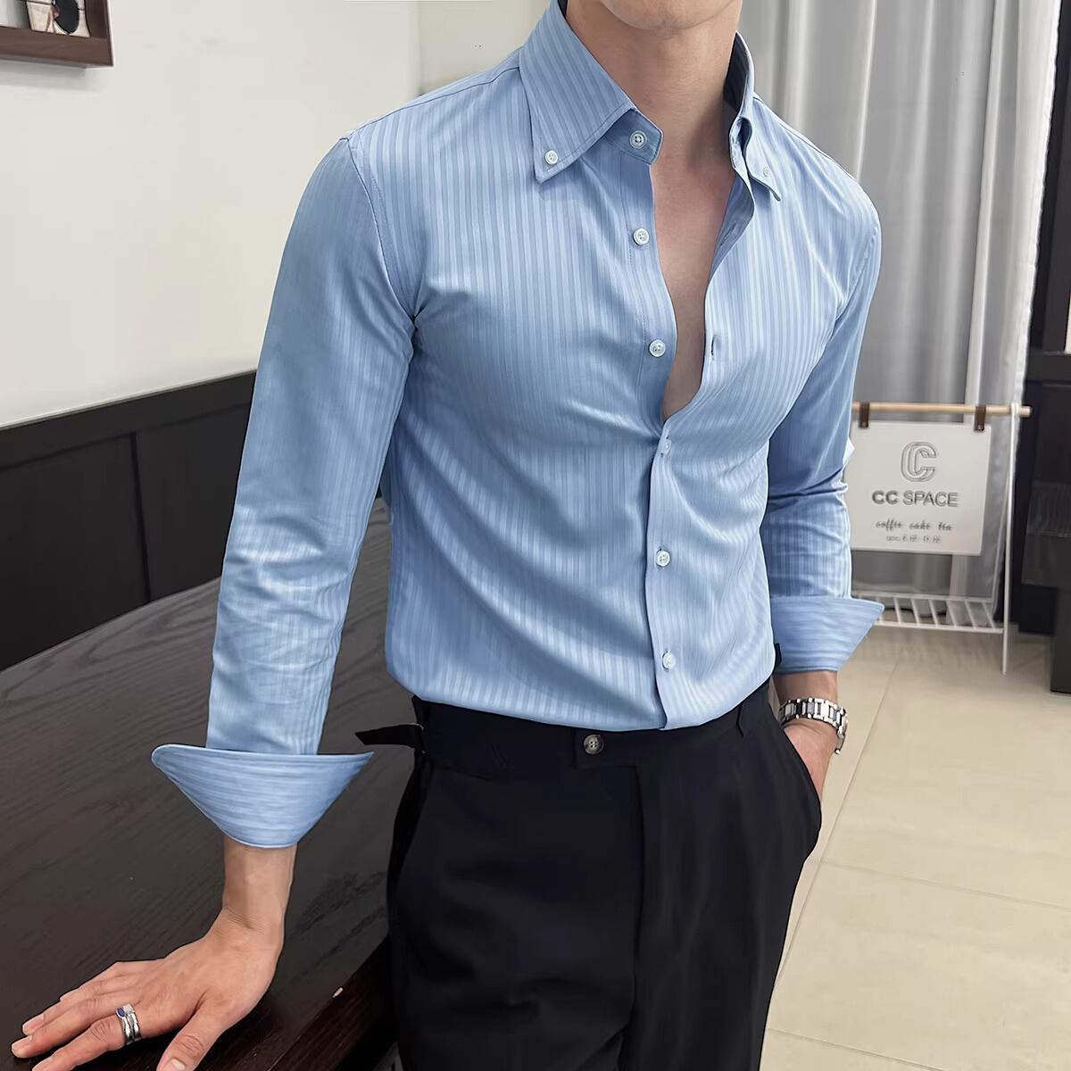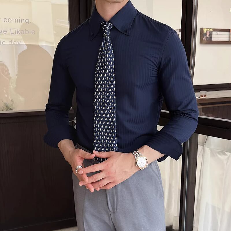 ビジネスシーンはもちろん、カジュアルな装いにも合わせやすい一枚です。