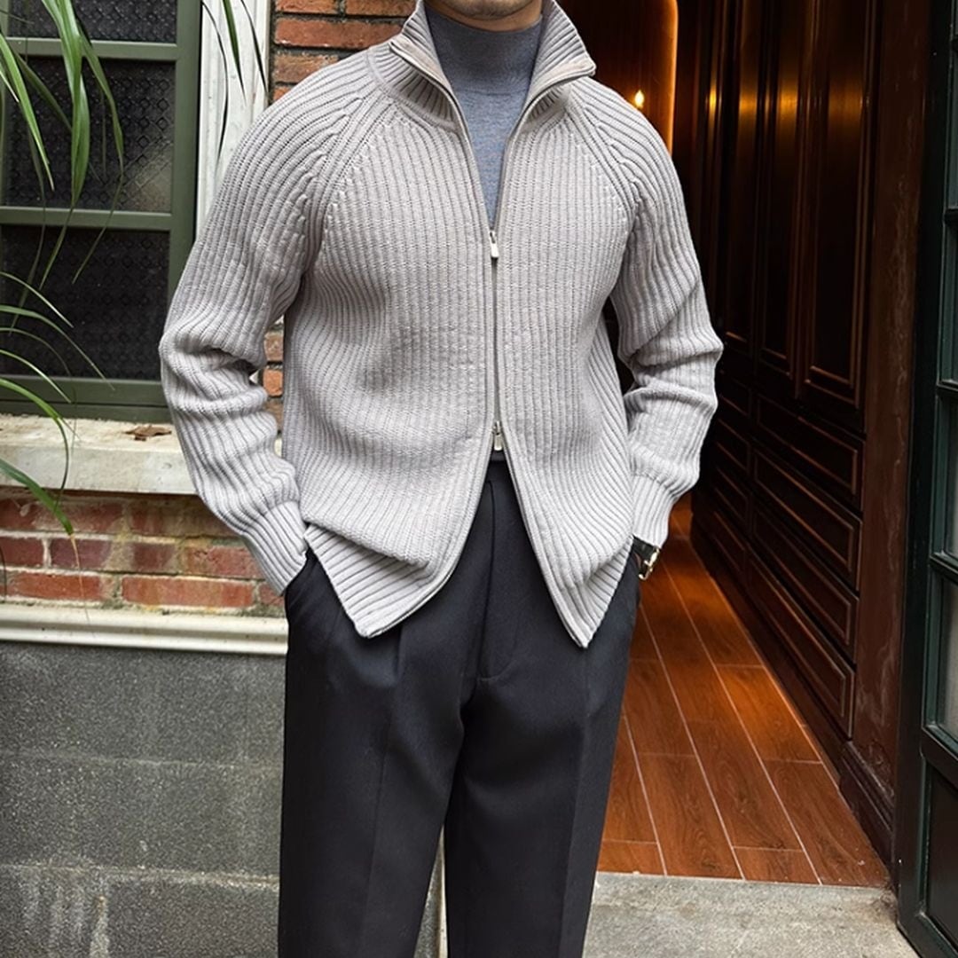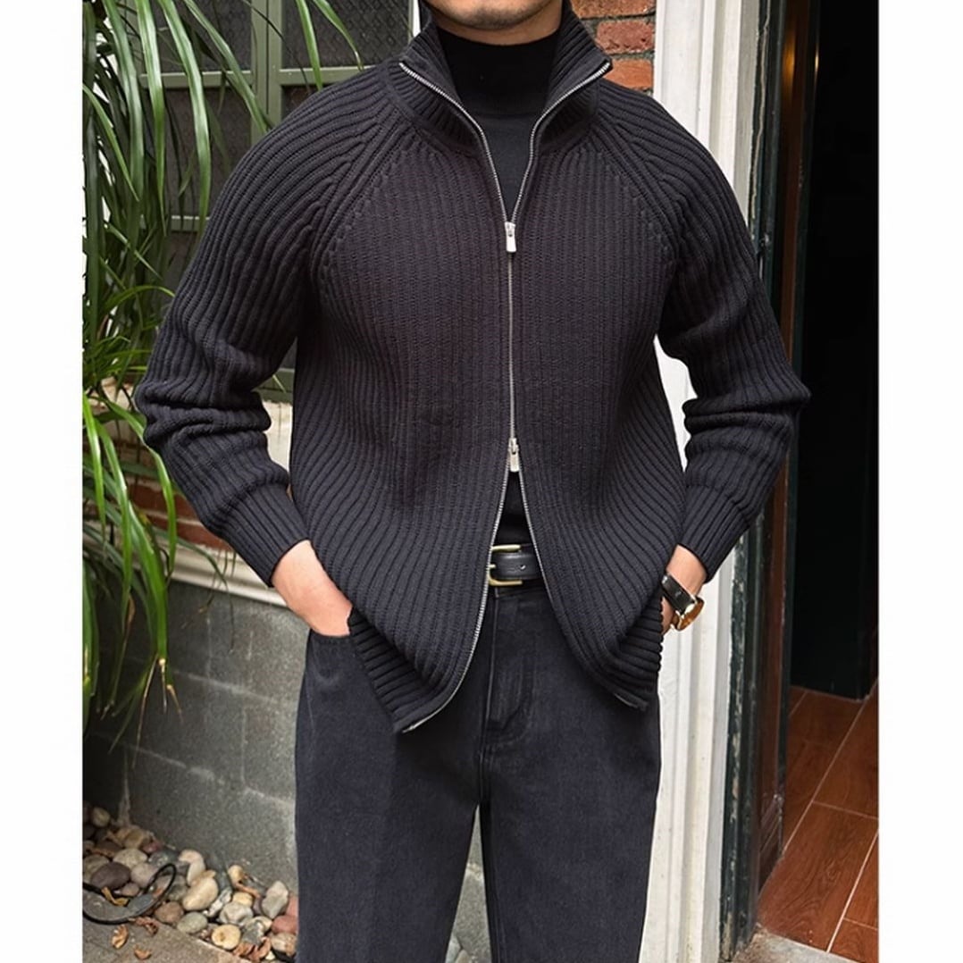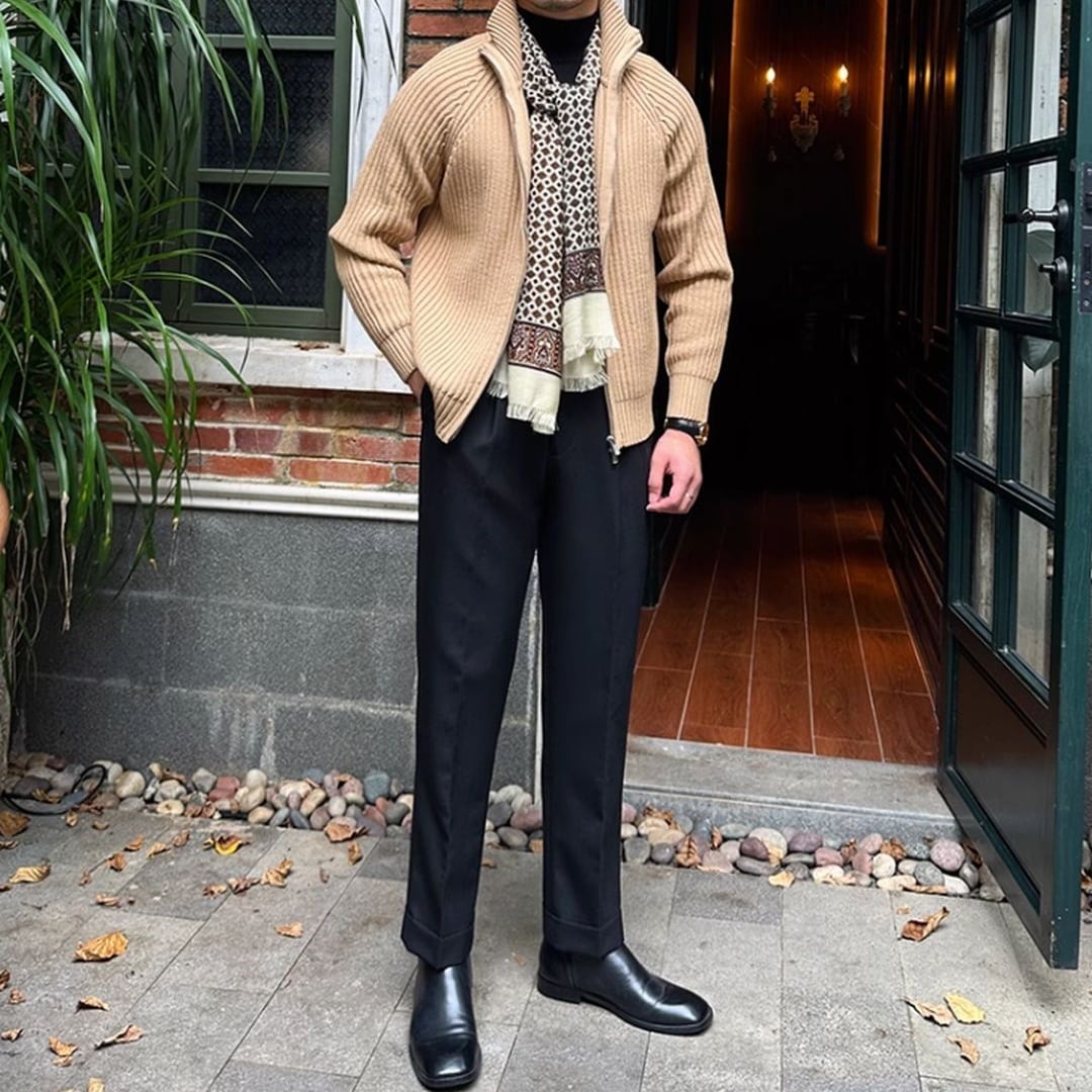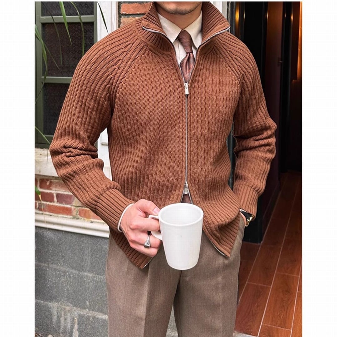 ニットの温もりとカーディガンのアクティブなスタイルが融合し、メンズの冬のスタイリングをクラスアップします。