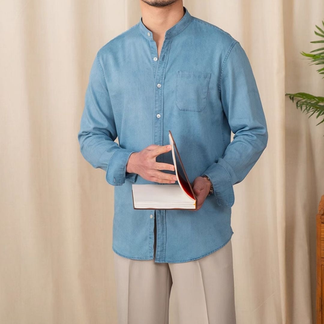 上品なブルーカラーが清潔感を演出し、ビジネスカジュアルな雰囲気を持ちます。