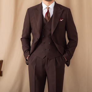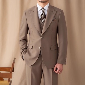 ジャケットとベストの組み合わせでフォーマルな印象を与え、ベストを外せばカジュアルに着こなせる。