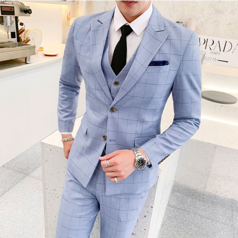 チェック柄シングルブレストスリムスーツ。